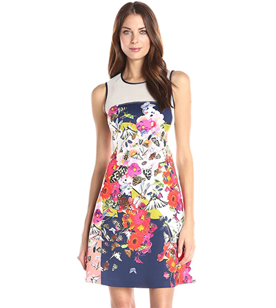 Concealed back zipper and button closures. Self: Polyester, viscose, spandex. Lining: Stretch crepe de chine - polyester. Washable, dry clean recommended. Imported. Lightweight, non-stretch fabric. Fitted at the bust and waist. Hits above the knee. True to fit..